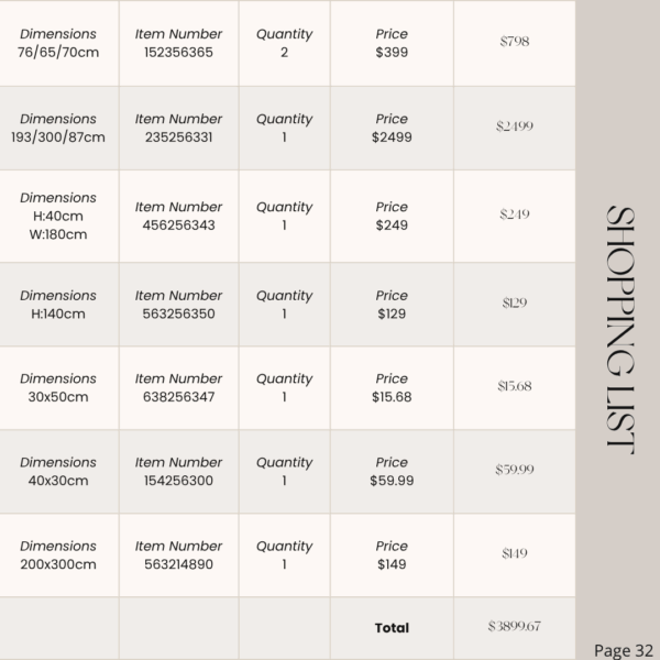 Pour chaque élément, je propose 3 styles différents, vous offrant un choix large et cohérent. Vous recevez ensuite un tableau détaillé :